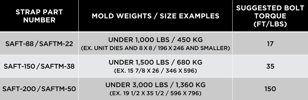 - If unintentionally left on when securing the parting line once the mold in the press and opened, the Safety Strap is engineered to break before the bolts shear.
