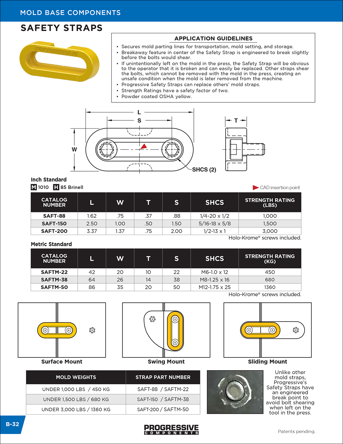 High Risk Activities: Safety Straps from Progressive Components keep mold halves secured and thus may result in high risk activity such as while transporting molds if mold weight exceeds Strap selection guidelines, or a Strap is unintentionally securing parting line as the mold is initially opened, or by an inadvertent dropping of the mold, as examples. In the event of the strap or bolts becoming damaged in any way at any time, all parts should immediately be replaced with new components. However, it is imperative that all safety guidelines, warnings, and procedures are specifically followed. Risks include but are not limited to physical injury, disability and/or death. You participate in these activities at your own risk.